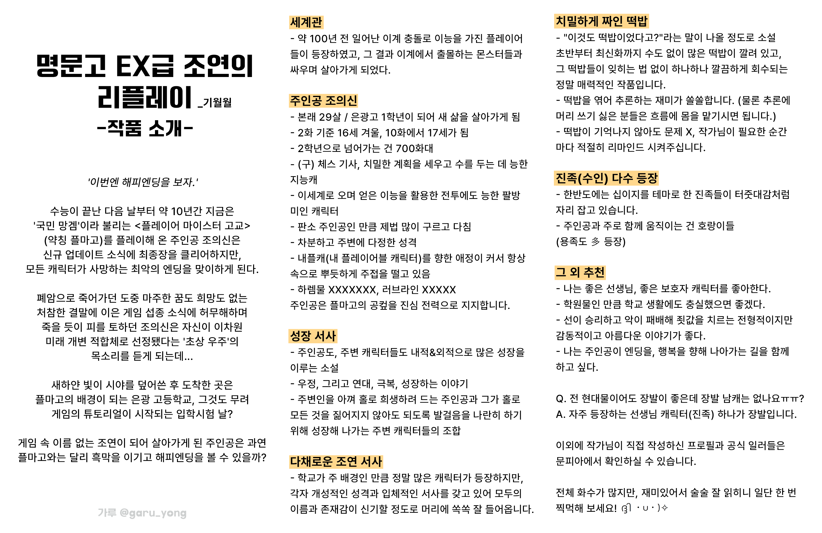 혹시나 작품 관련으로 궁금한 점이 있으시다면 부족하지만 답변해 드릴 수 있으니 가루(@garu_yong) 계정 스핀으로 물어보셔도 됩니다!